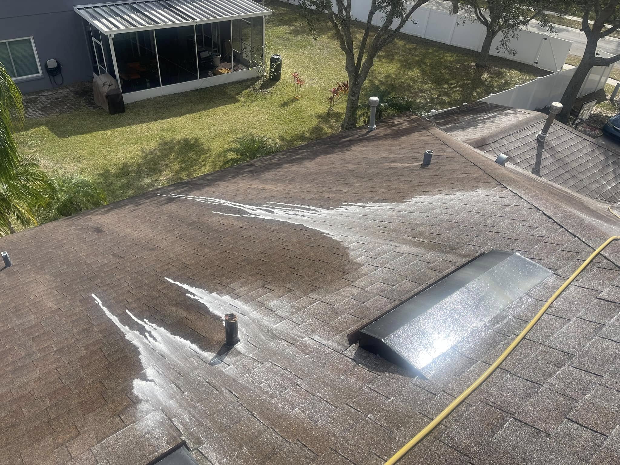 Florida roofs attract significant organic growth, especially the black streaks caused by Gloeocapsa Magma—an airborne algae common throughout Wesley Chapel and Tampa Bay. High-pressure roof cleaning is unsafe and can damage shingles or tiles. Our soft wash roof cleaning system safely treats roofs using low-pressure application and specialized detergents that break down algae, mold, and lichen while preserving surface integrity.